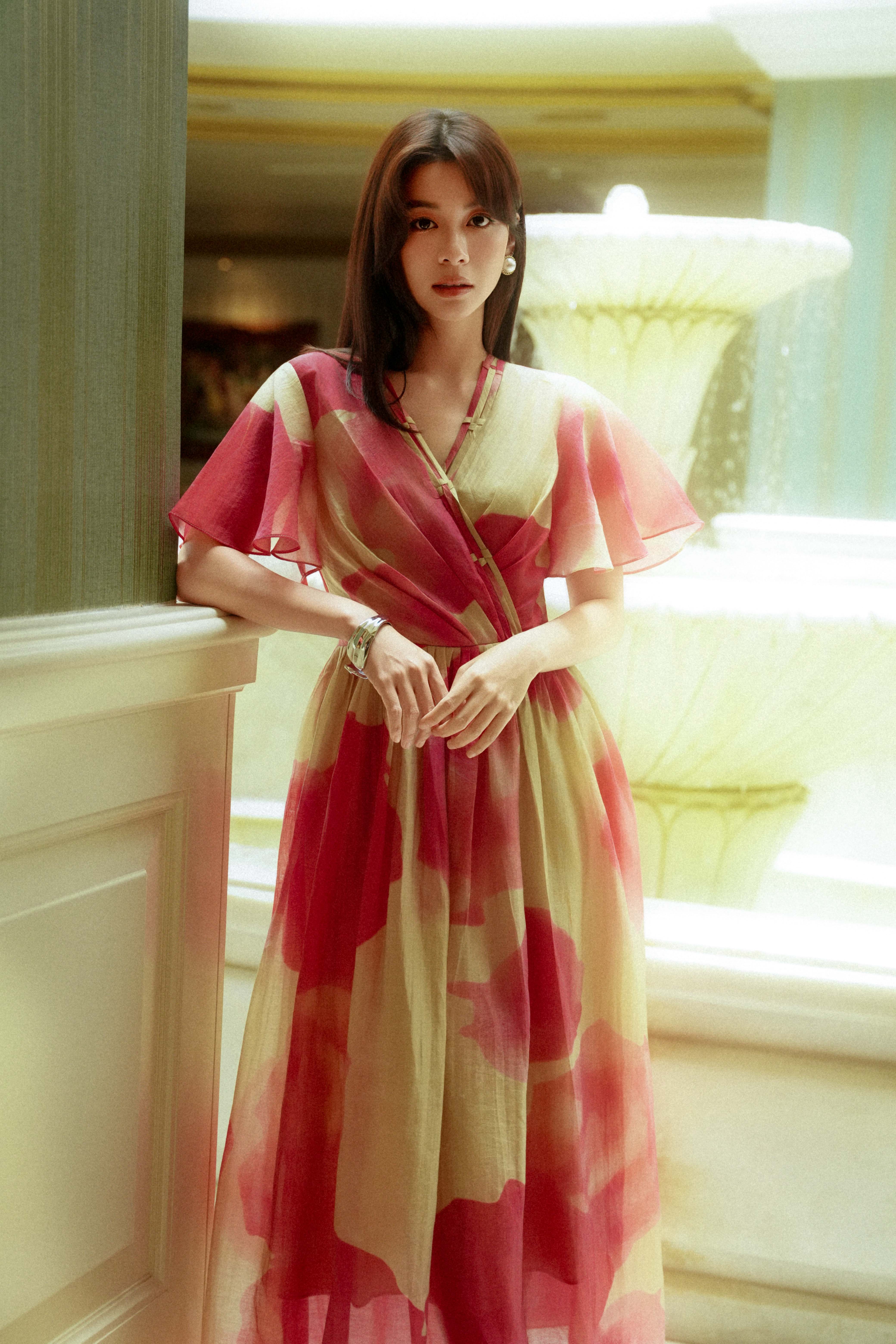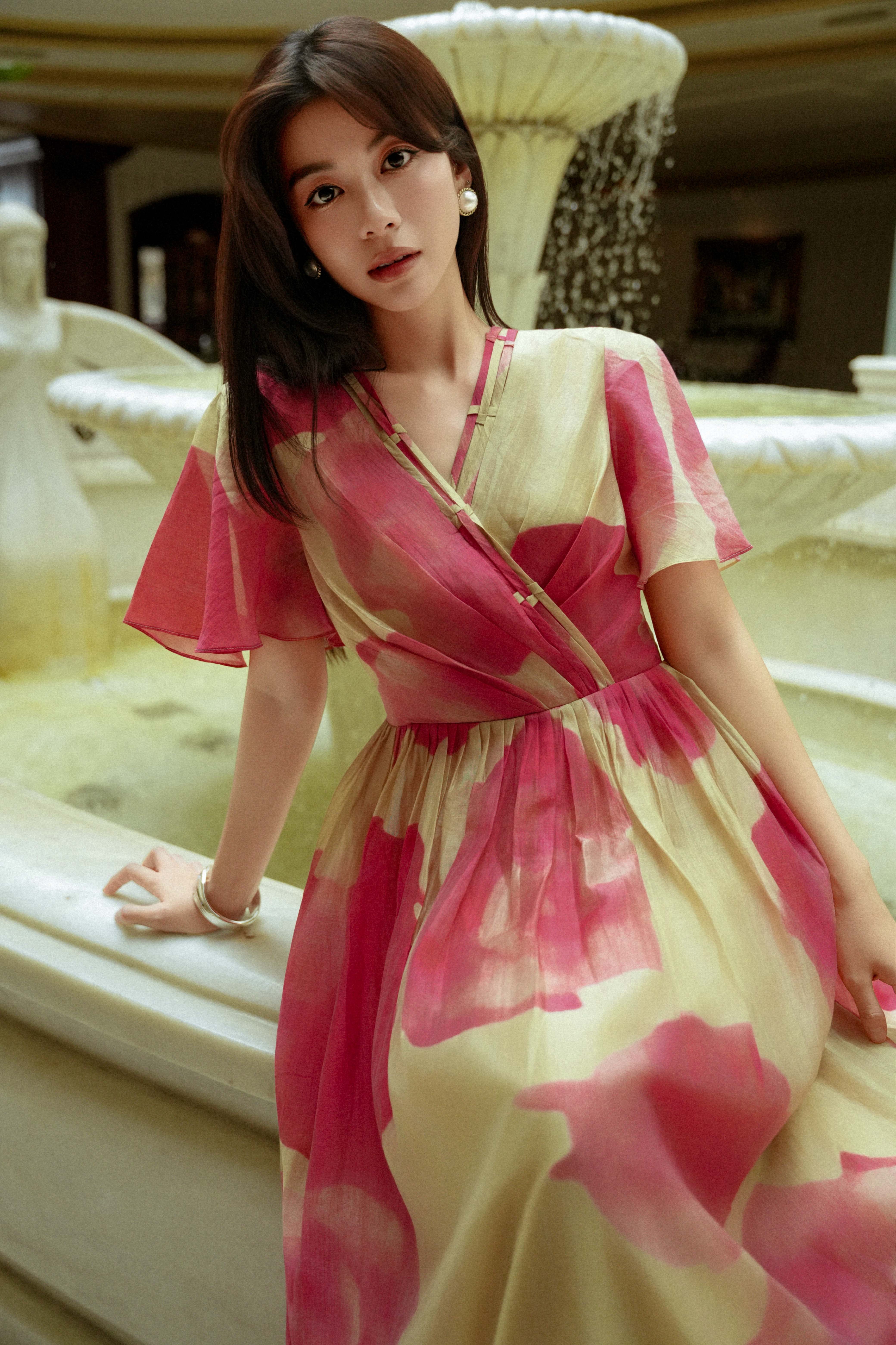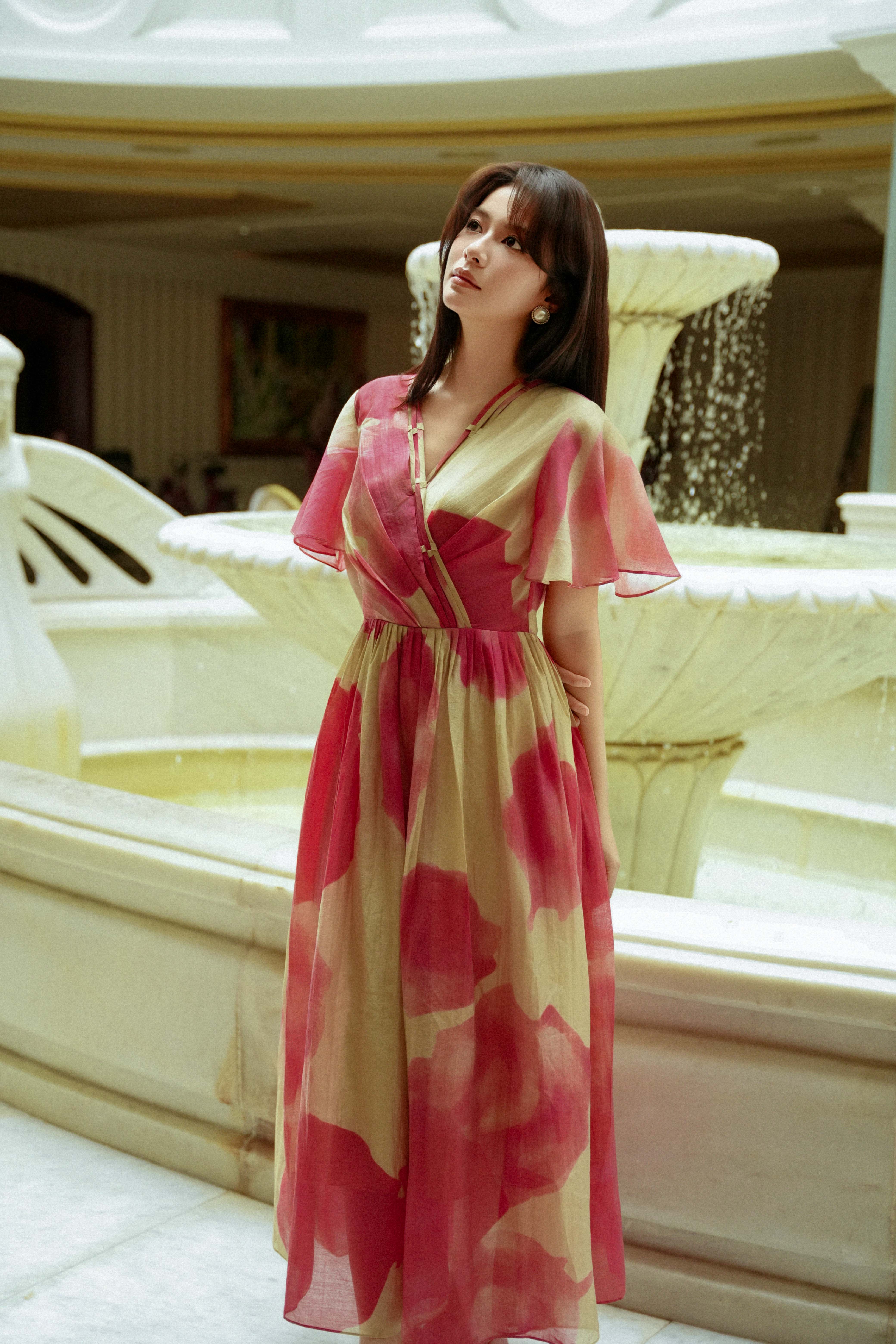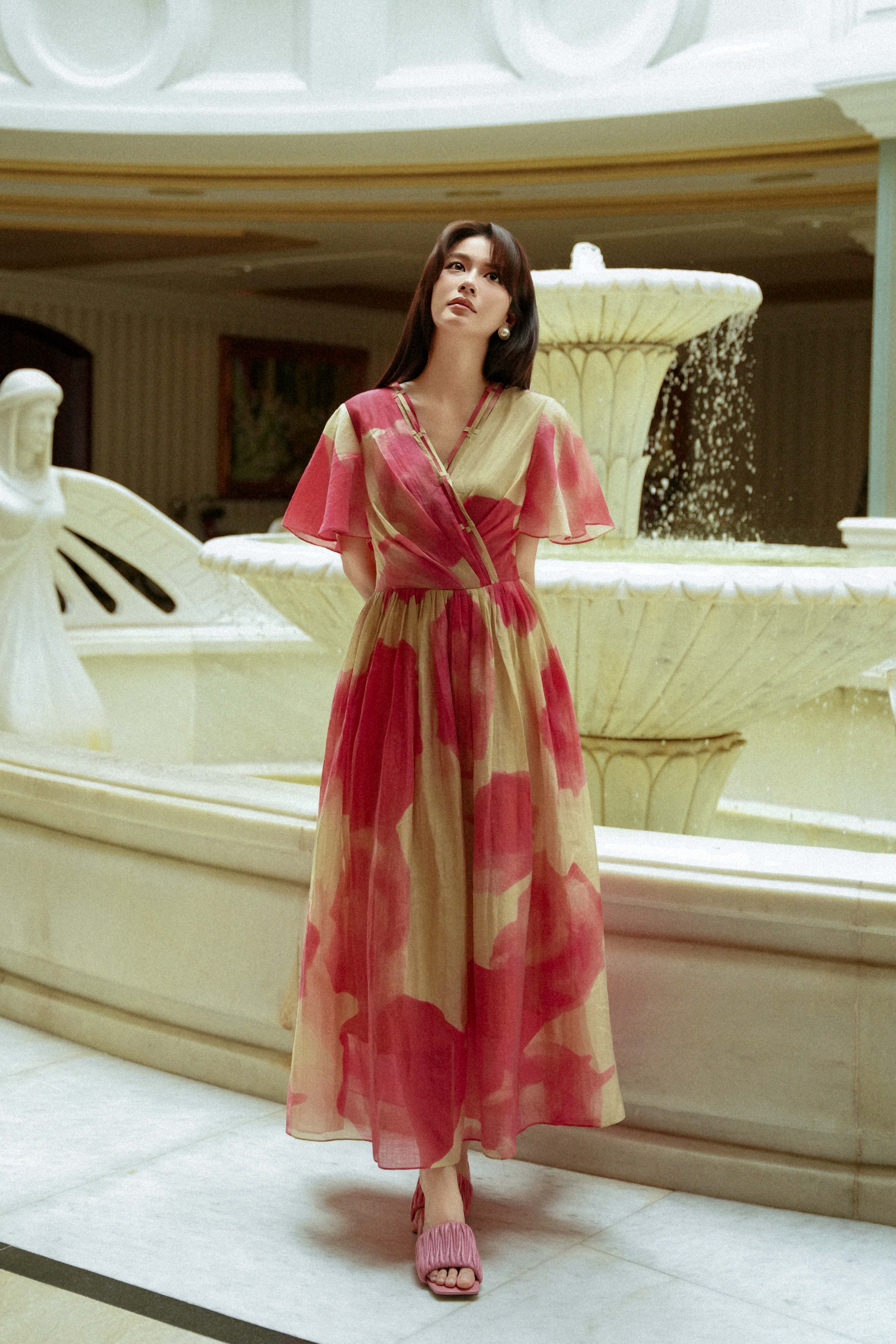 Beige & Pink Organza Flared Dress