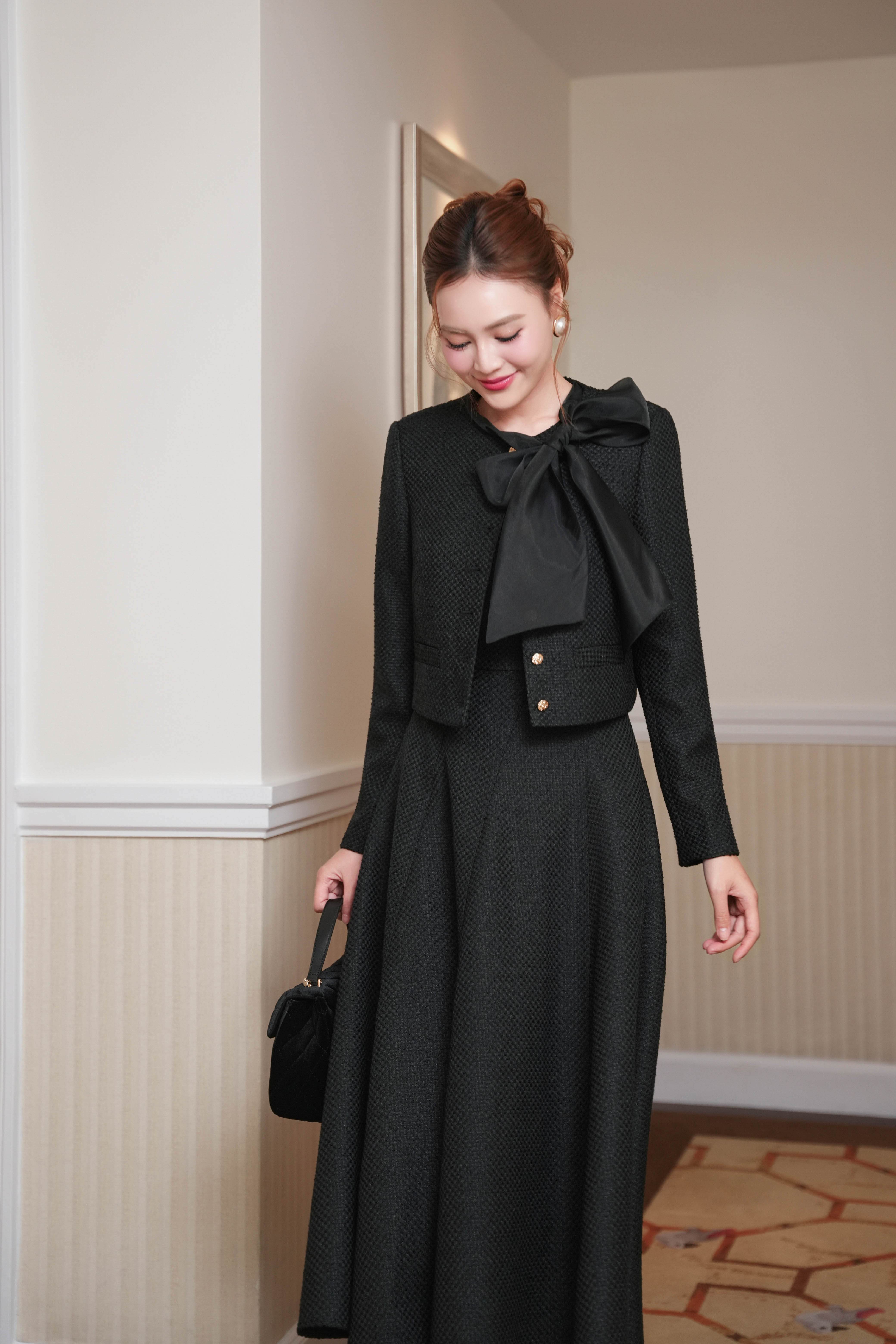 Black Bowtie Tweed Flared Dress