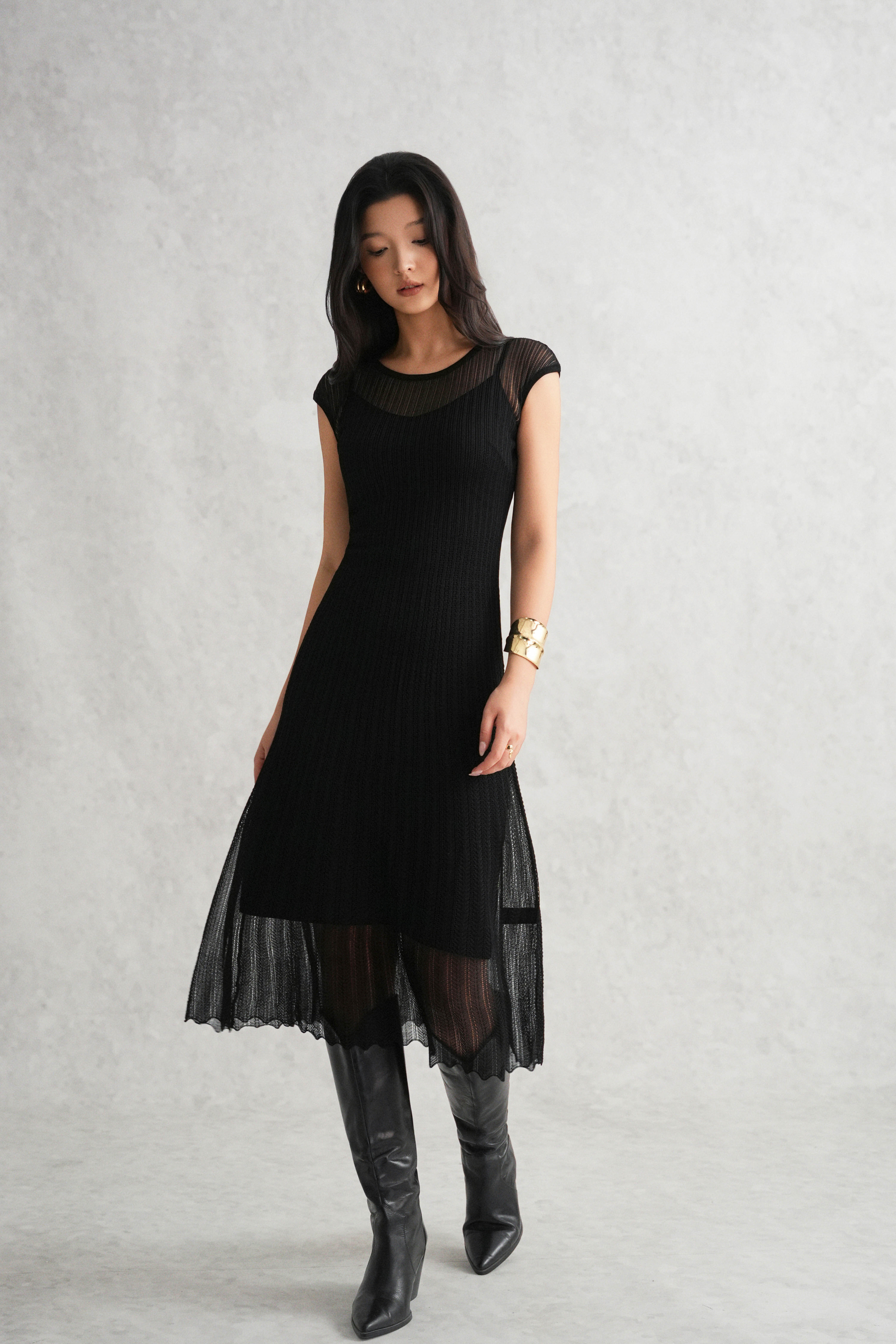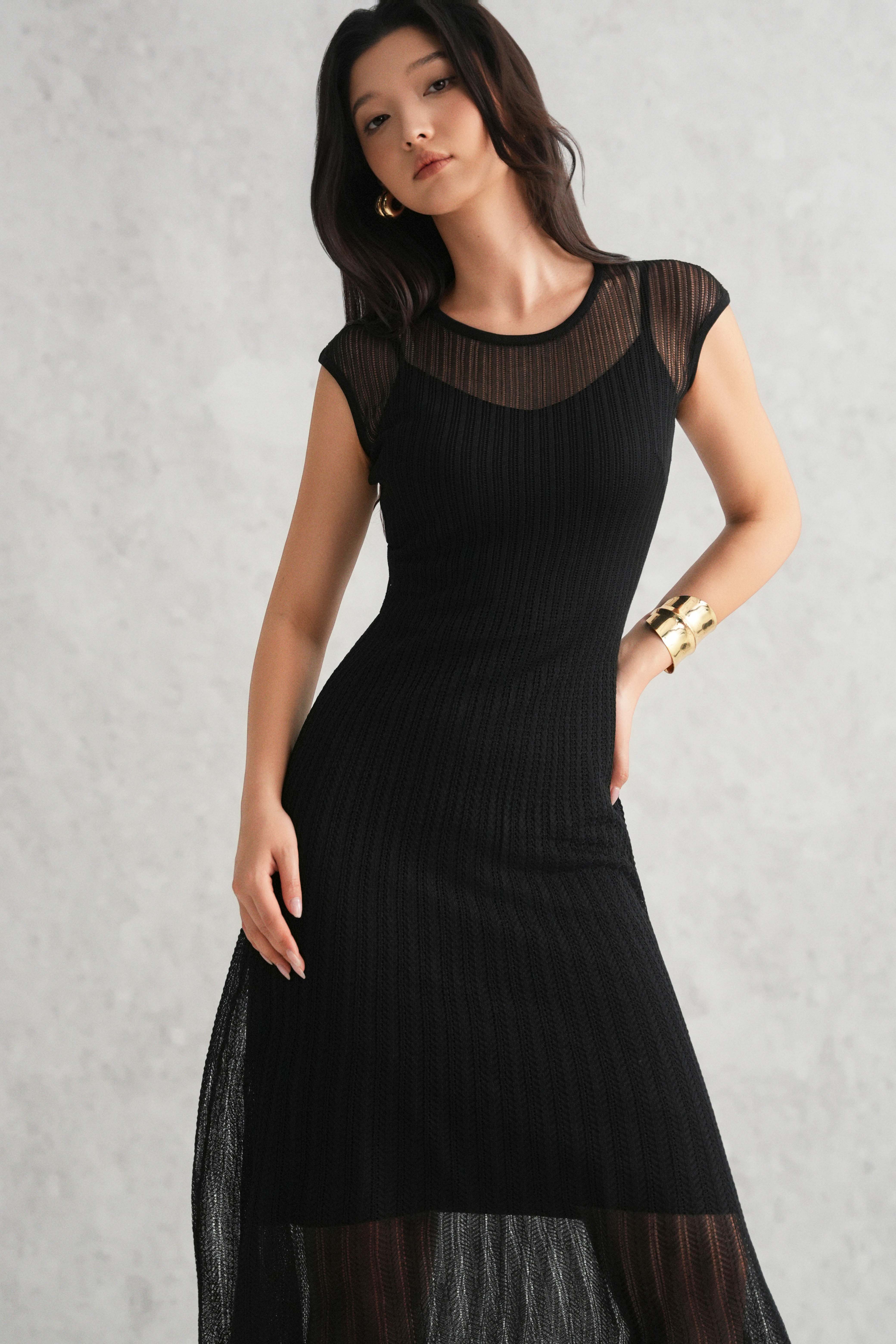Black Sheer Knit Flared Dress
