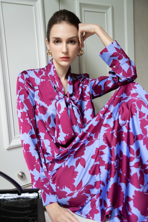 Blue Floral Silk Loose Dress