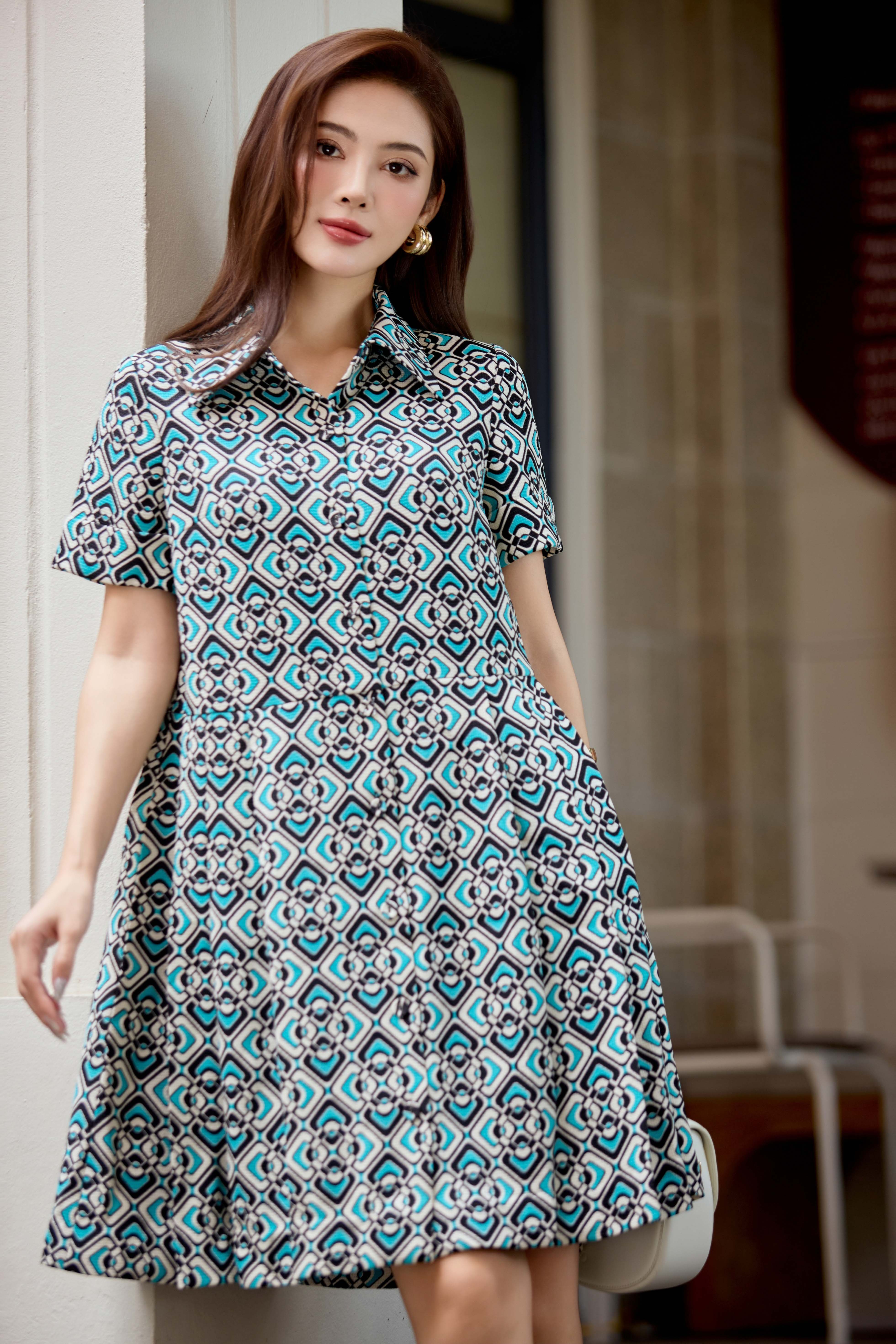 Blue Geomitric Midi Raw Dress