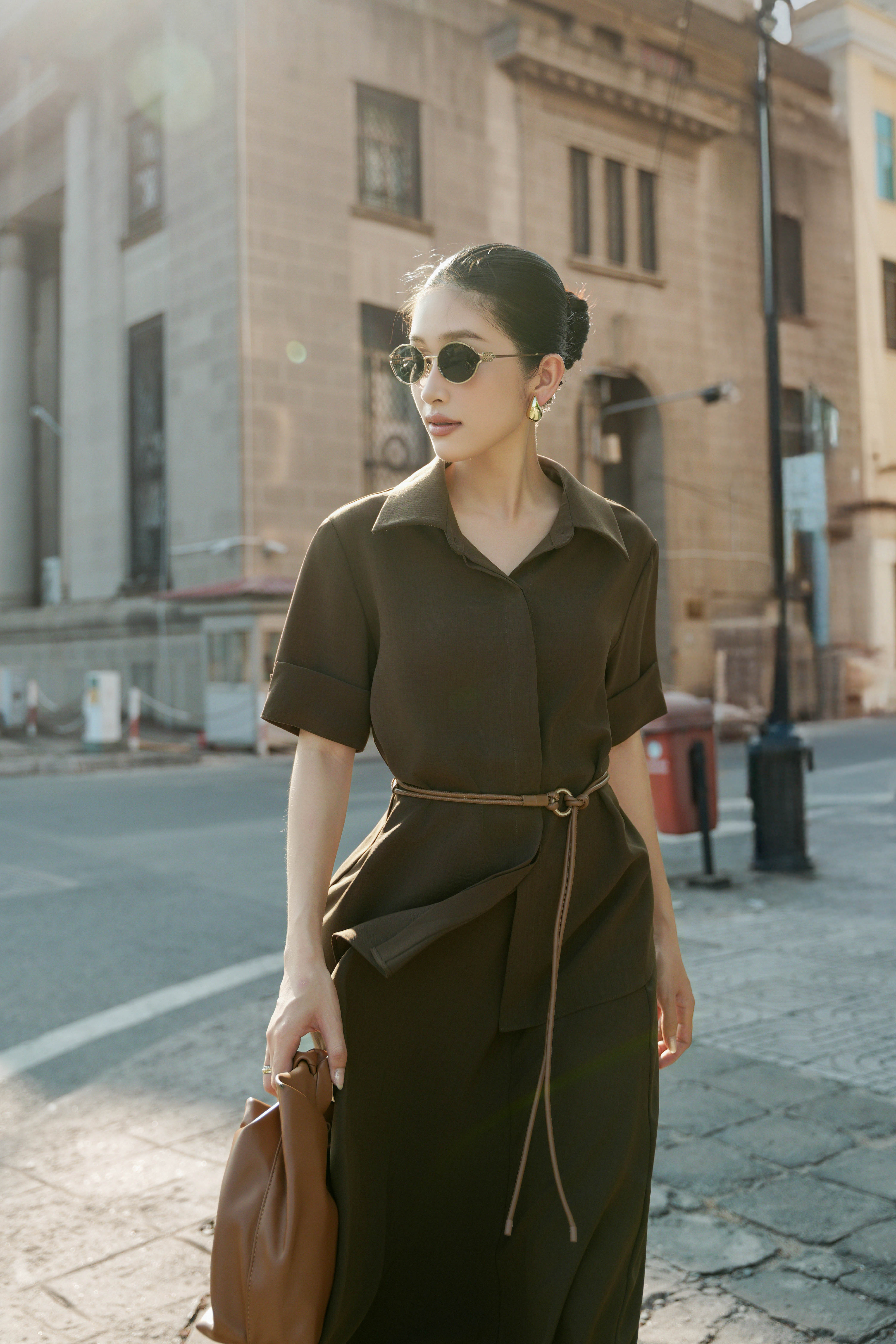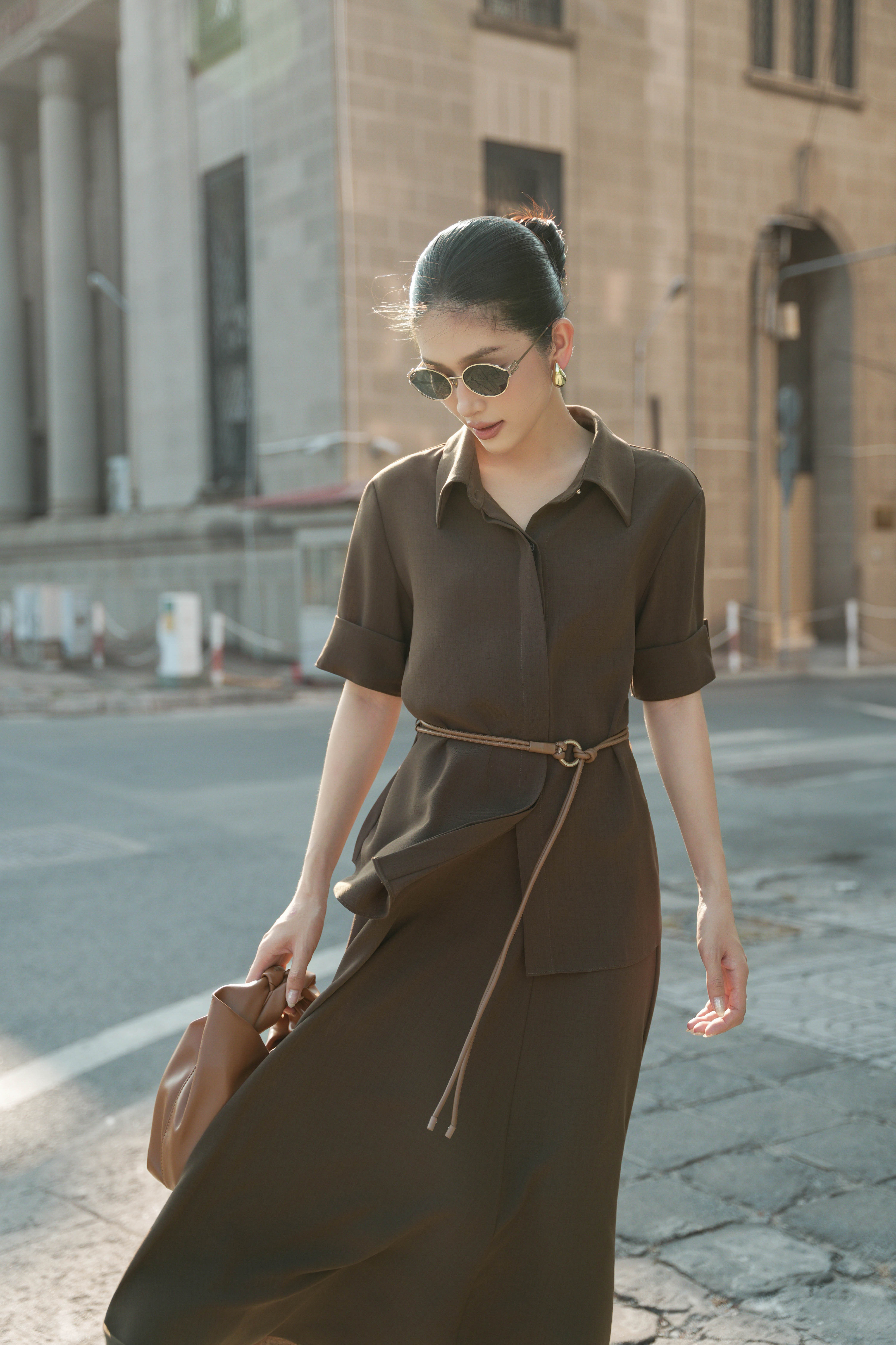 Dark Brown Woven Shirt With Belt