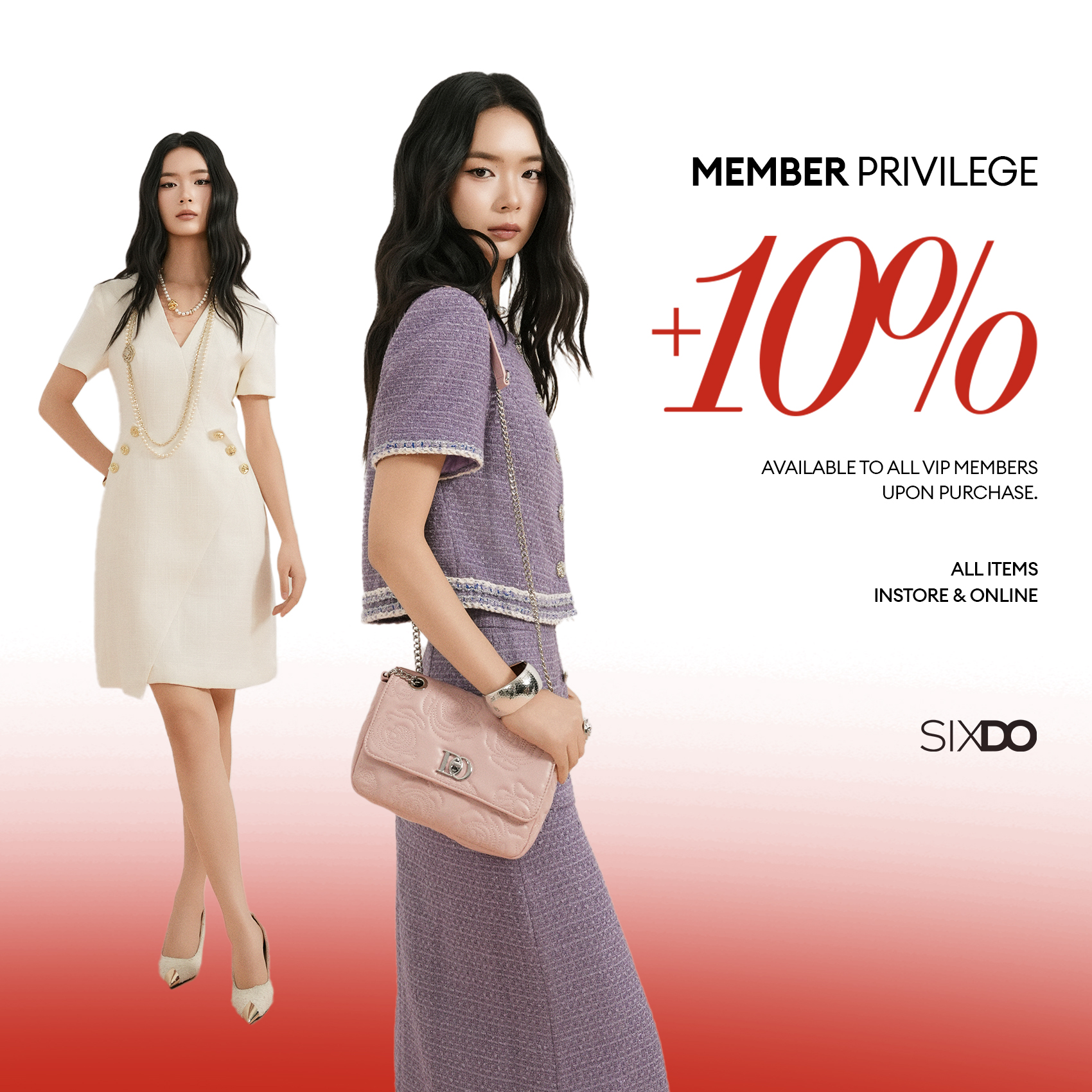Nếu nàng là thành viên của SIXCLUB – cộng đồng khách hàng thân thiết của SIXDO, thì tin vui là nàng sẽ được tặng thêm 10% ưu đãi, nâng tổng mức giảm lên đến 40%. Đây là lời tri ân đặc biệt mà SIXDO dành cho những khách hàng đã luôn đồng hành và tin tưởng thương hiệu trong suốt thời gian qua.