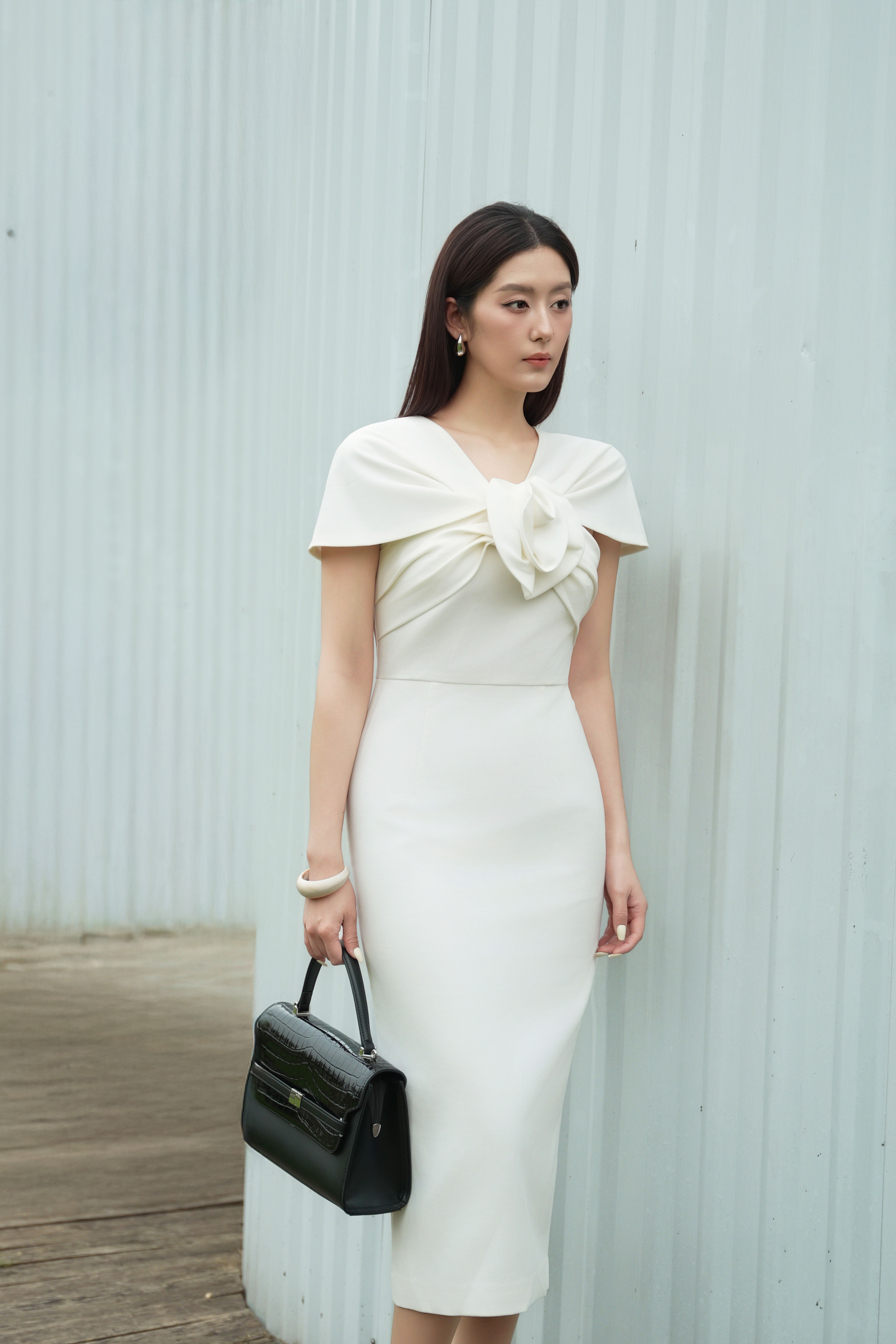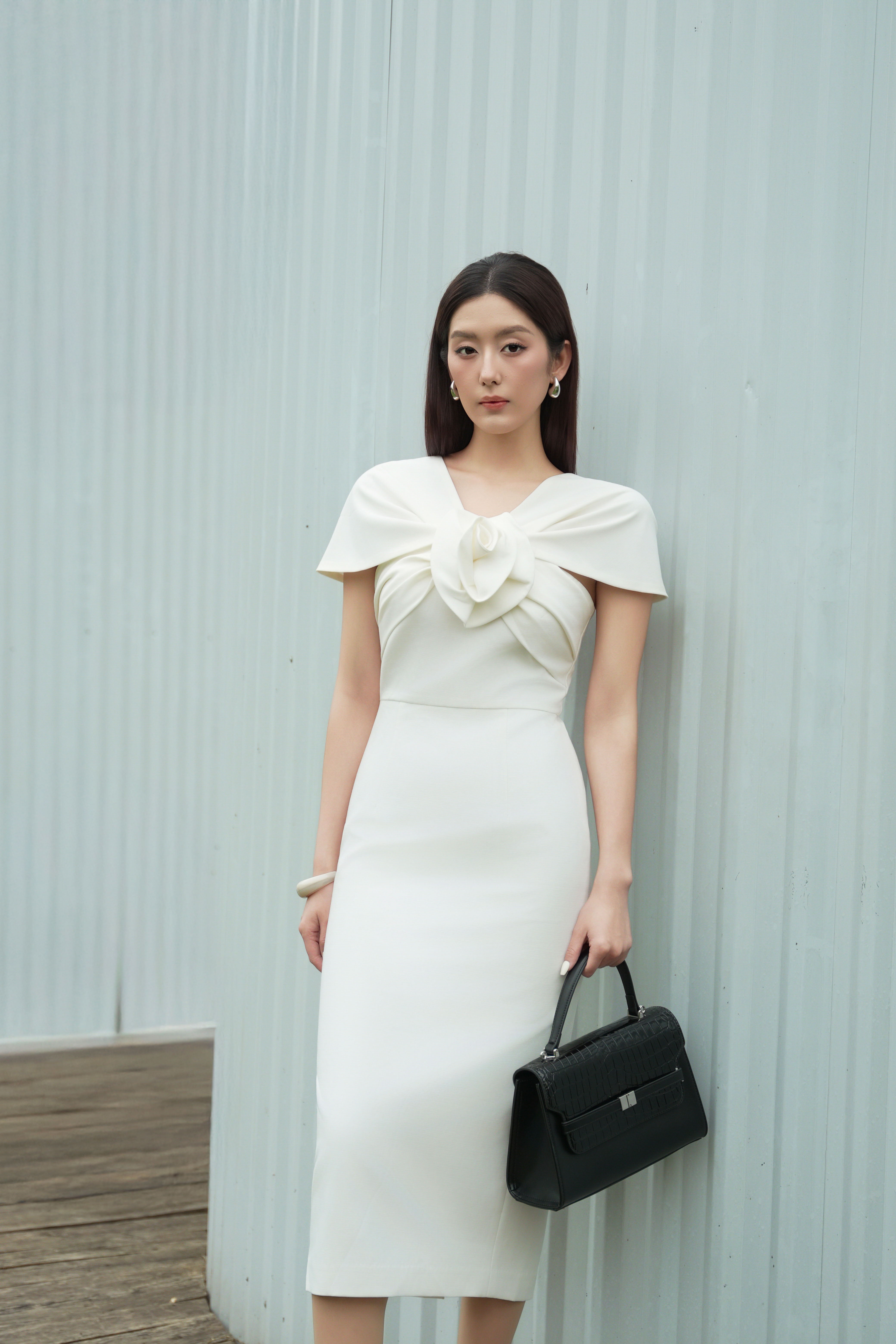 White 3D Flower Woven Pencil Dress